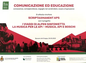 Progetto: I viaggi di Alpen Sinfonietta la musica per le api – Un’ orchestra giovanile sarà la VOCE dei territori montani attraverso la quale comunicare il valore e l’importanza del patrimonio apistico, della biodiversità e del patrimonio alpino – 2021-2026 – https://www.facebook.com/AlpenSinfoniettaMusicBee